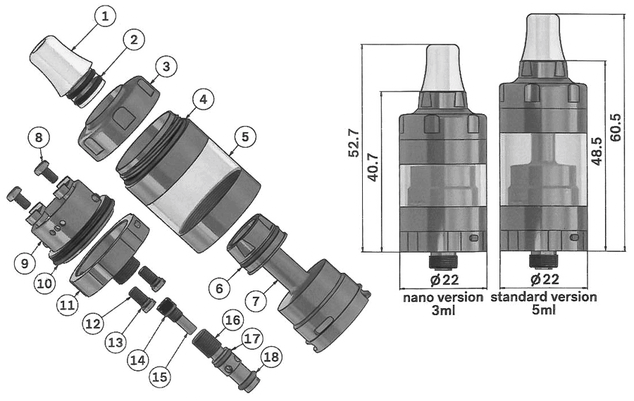 Tank verze Nano Basic s kapacitou 3 ml využívá osvědčené horní plnění. Po odšroubování horního uzávěru jednoduše naplníte nádržku velkým plnicím otvorem. Díky velkému plnicímu otvoru nebudete mít problém naplnit nádrž jakoukoli lahví. Tělo nádrže je vyrobeno z polykarbonátu. Proto doporučujeme vyhnout se silným citrusovým příchutím, banánům nebo zeleninovým macerátům, se kterými může mít polykarbonát problém. Horní odšroubovatelná část horního uzávěru má opačný závit, a proto se šroubuje na pravou stranu.