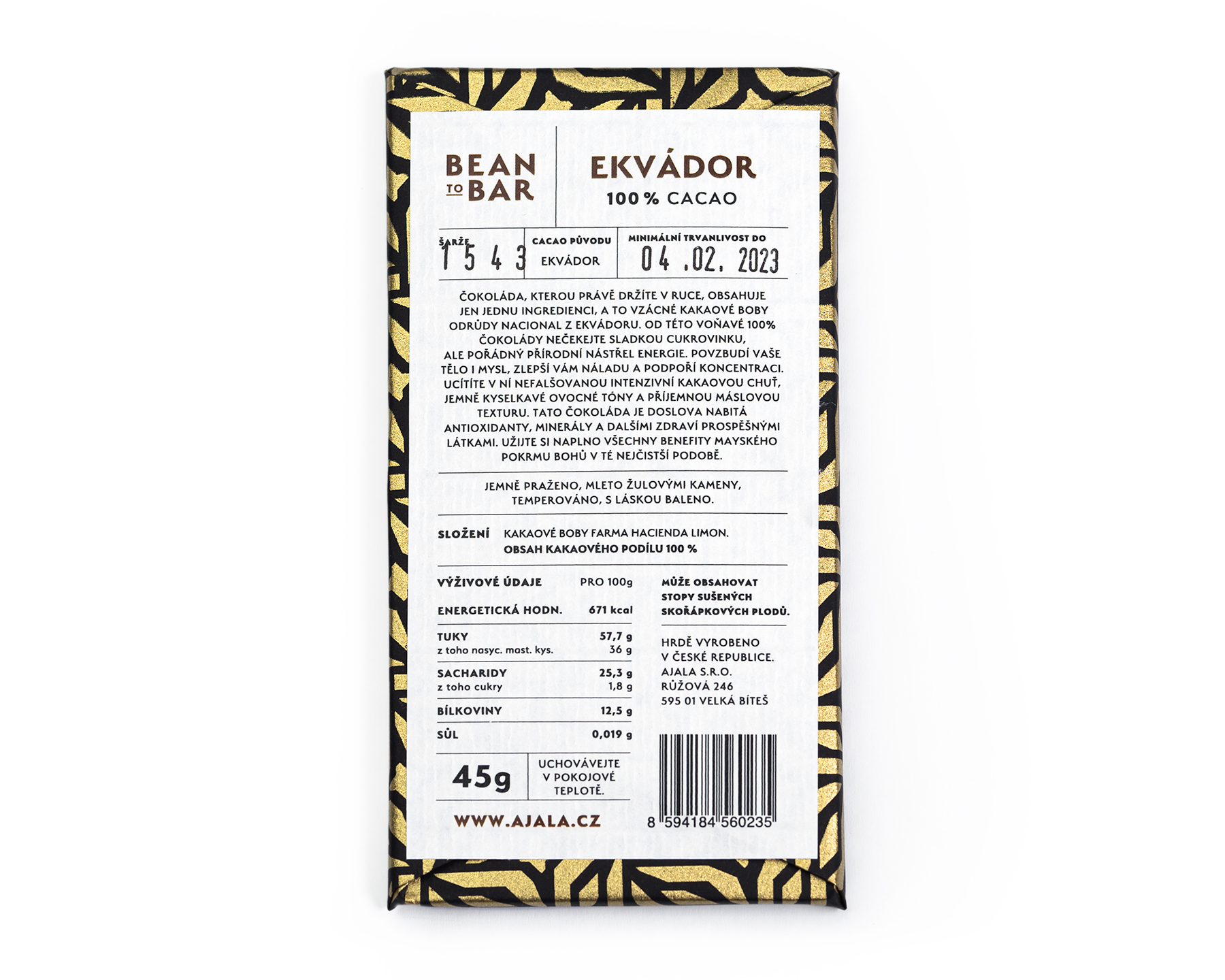 Tato jedinečná čokoláda obsahuje jen jednu ingredienci, a to vzácné kakaové boby odrůdy Nacional z Ekvádoru. Od voňavé 100% tabulky nečekejte sladkou cukrovinku, ale pořádný přírodní nástřel energie.