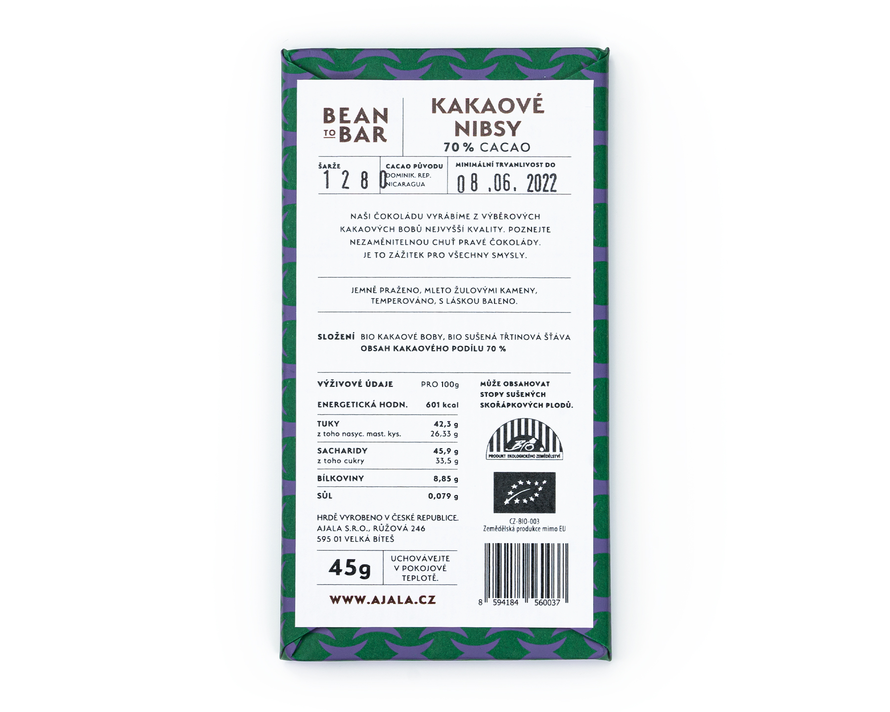 | Složení | bio kakaové boby, bio sušená třtinová šťáva, bio kakaové nibsy 15% |