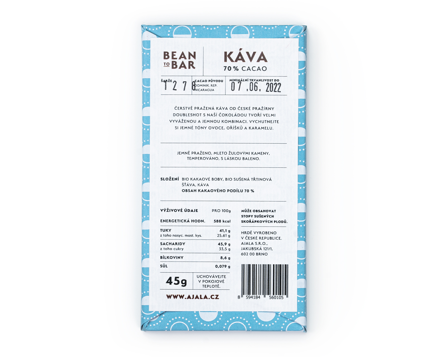 | Složení | bio kakaové boby, bio sušená třtinová šťáva, káva doubleshot |