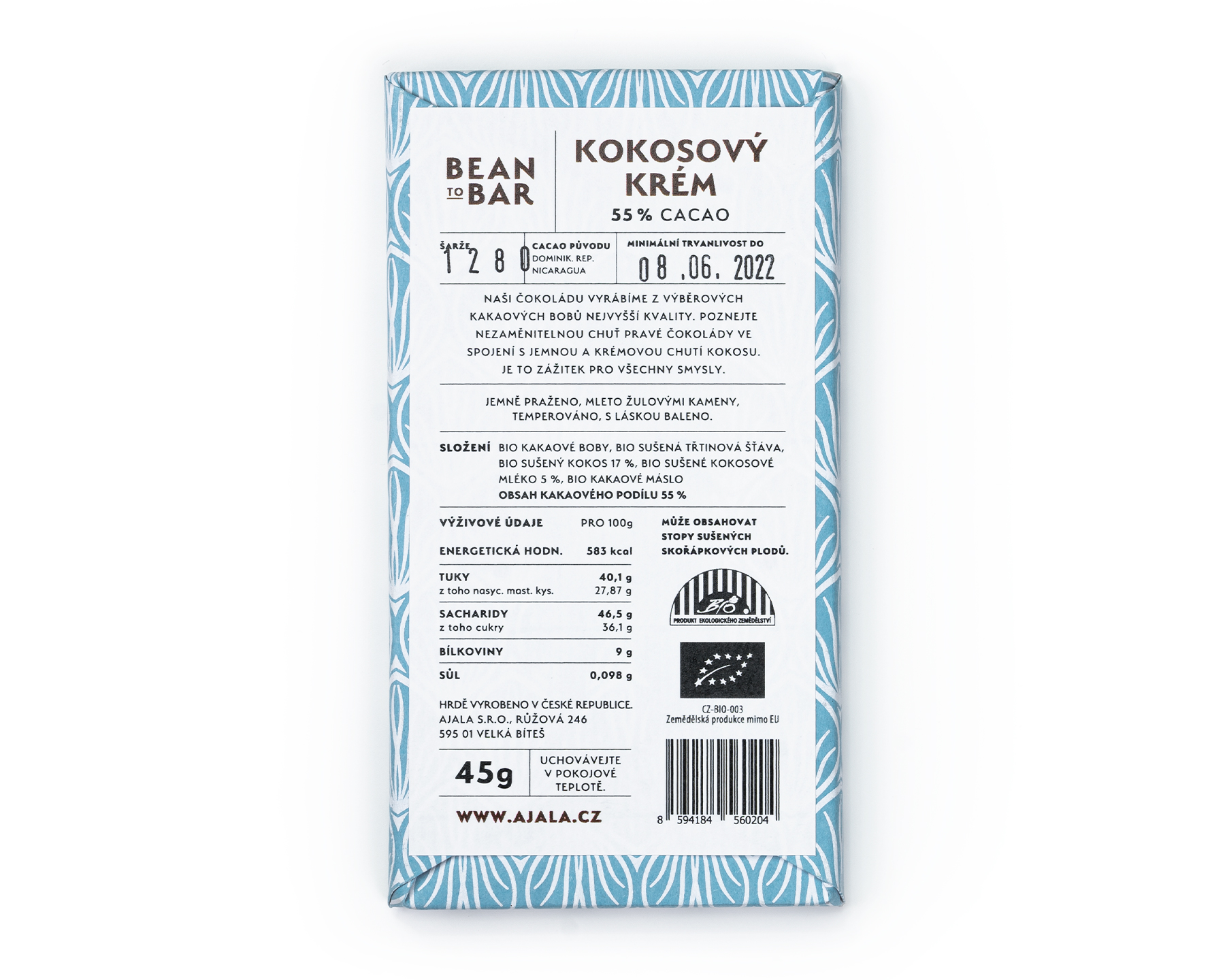 | Složení | bio kakaové boby, bio sušená třtinová šťáva, bio sušený kokos 16 %, bio kakaové máslo, bio sušené kokosové mléko 4 % |