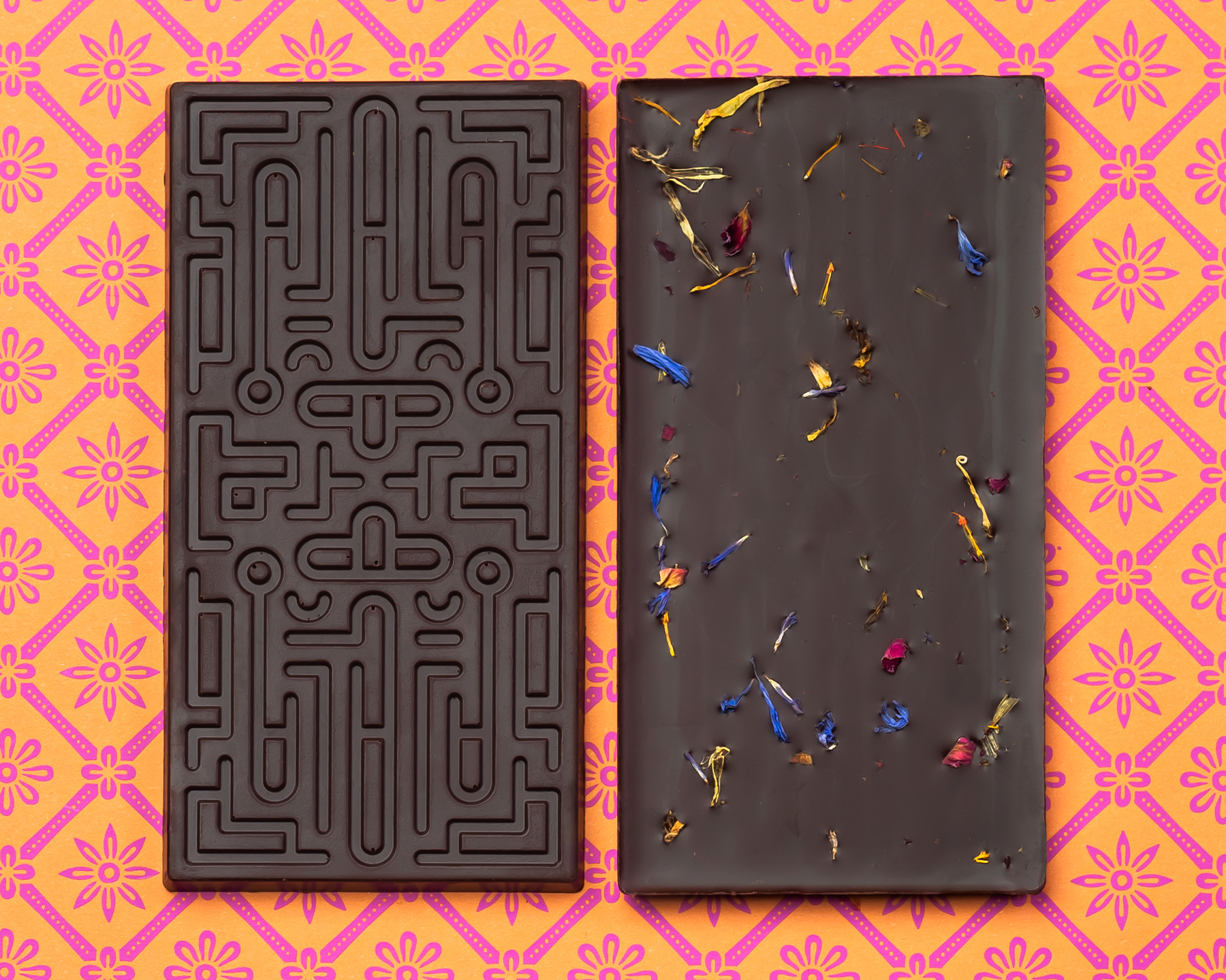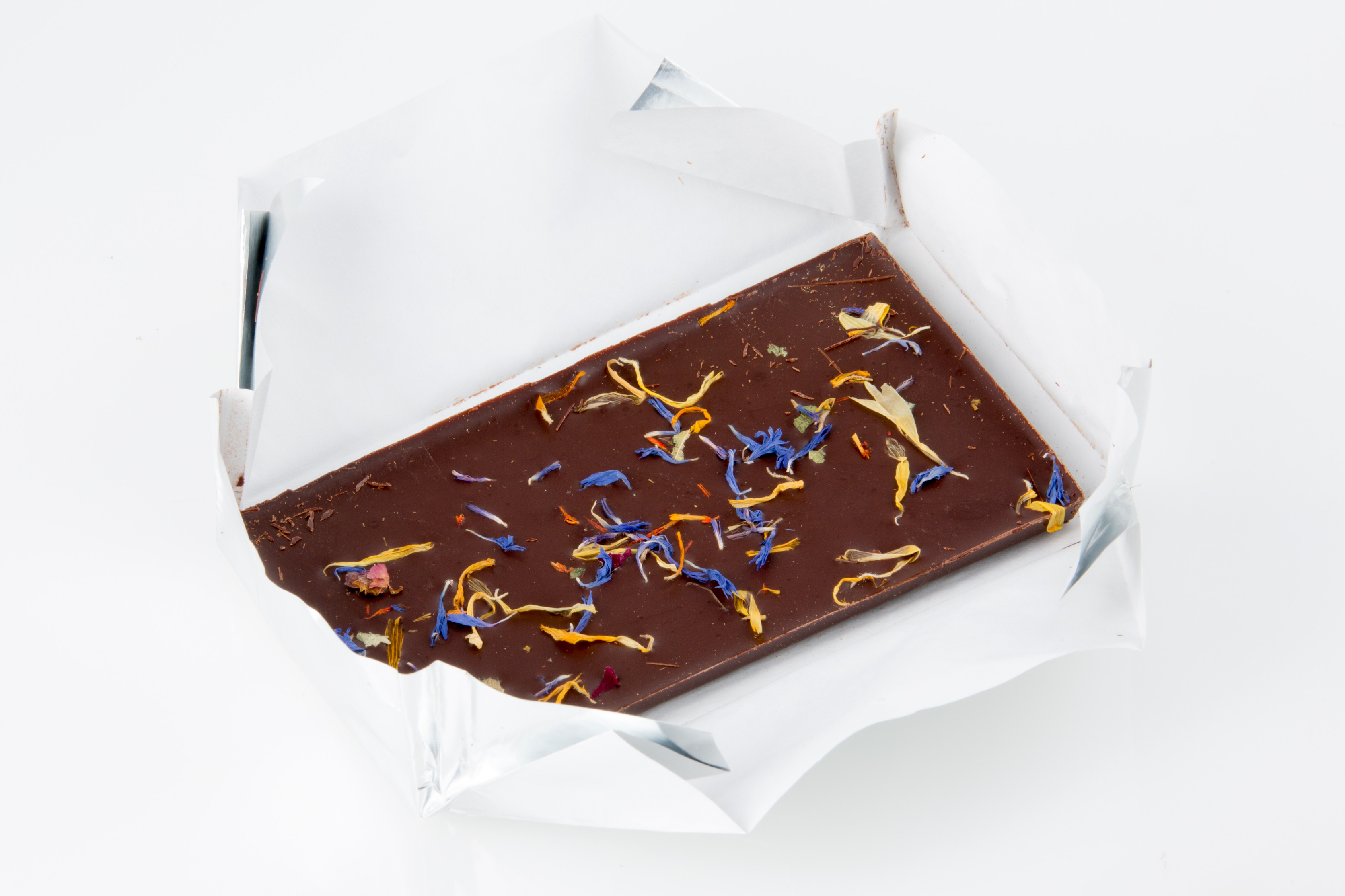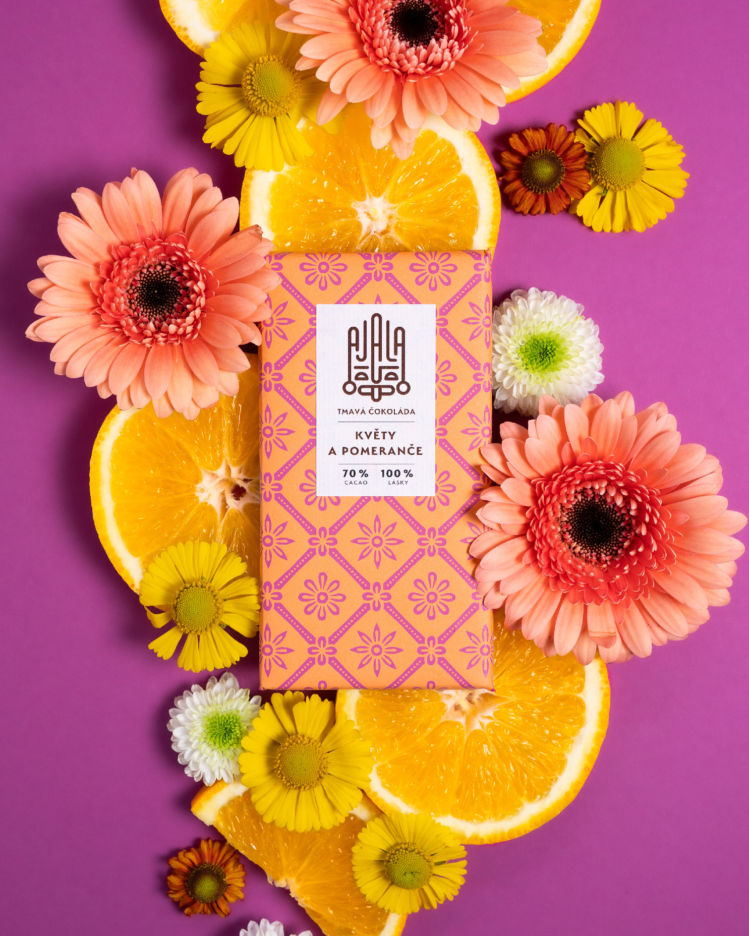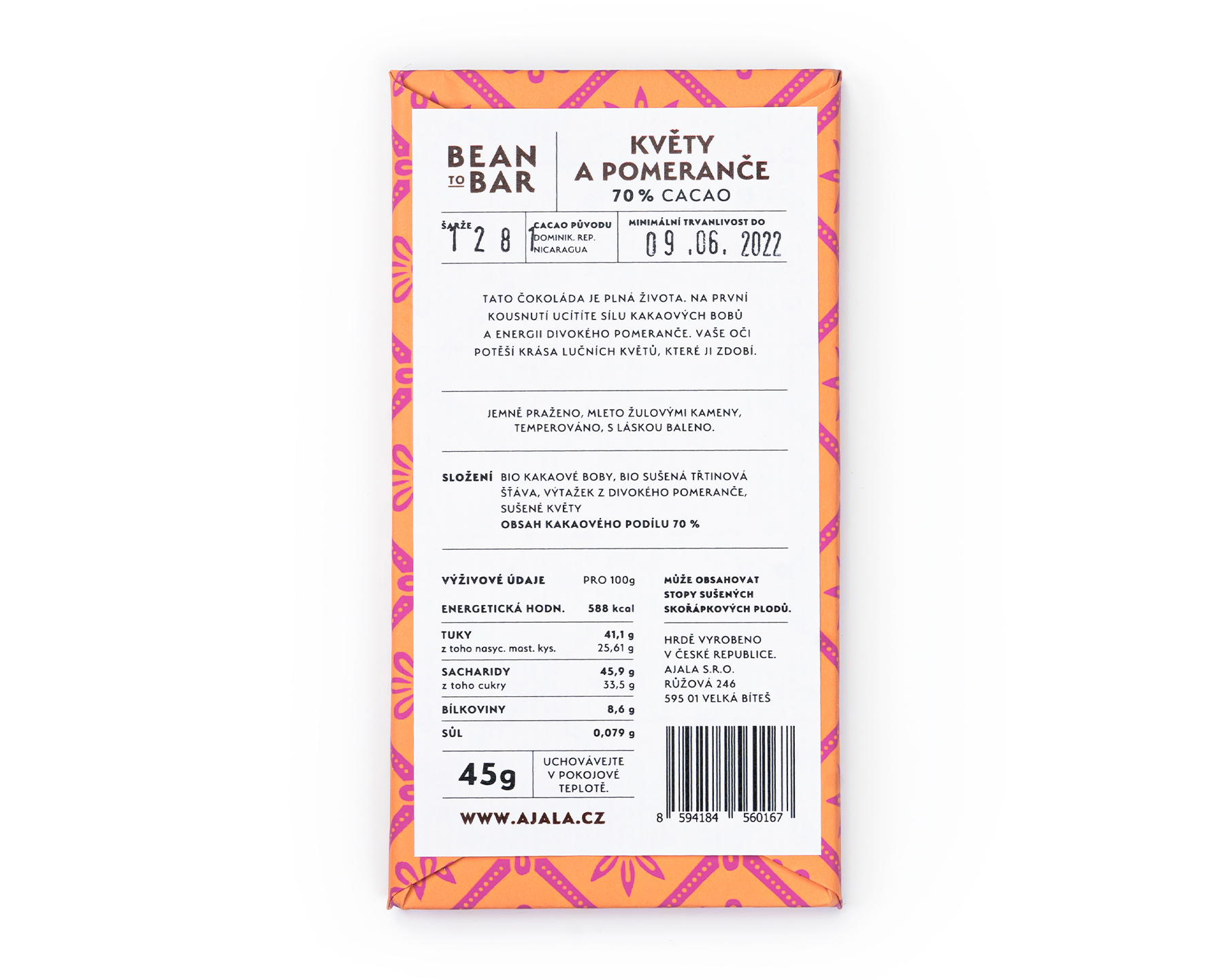 | Složení | bio kakaové boby, bio sušená třtinová šťáva, bio kakaové boby, výtažek z divokých pomerančů, sušené květy |