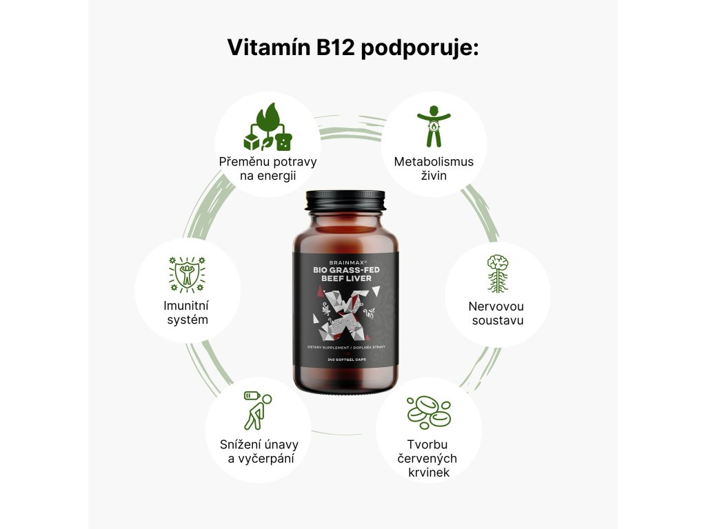 Vitamín B12 pomáhá při přeměně potravy na energii v těle. Hraje klíčovou roli v metabolismu sacharidů, tuků a bílkovin. Dále přispívá k normální činnosti nervové soustavy, tvorbě červených krvinek a přispívá ke snížení únavy a vyčerpání. Vitamin B12 je důležitý pro normální fungování imunitního systému.