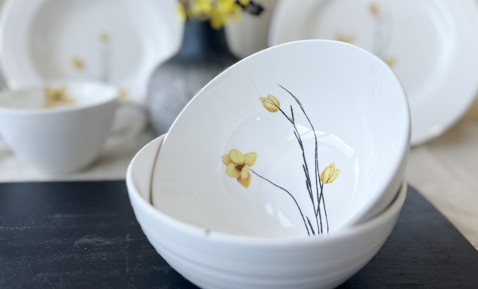 Jídelní sada Croft Spring přináší do vašeho domova svěžest jara a jemnou eleganci. Porcelánová jídelní souprava je inspirována krásou přírody a vyniká čistým designem s embosovanými okraji a jemným květinovým motivem v žlutých a černých tónech. Porcelánové talíře mají zdobené okraje, zatímco misky a hrnky jsou embosované po celé vnější straně.