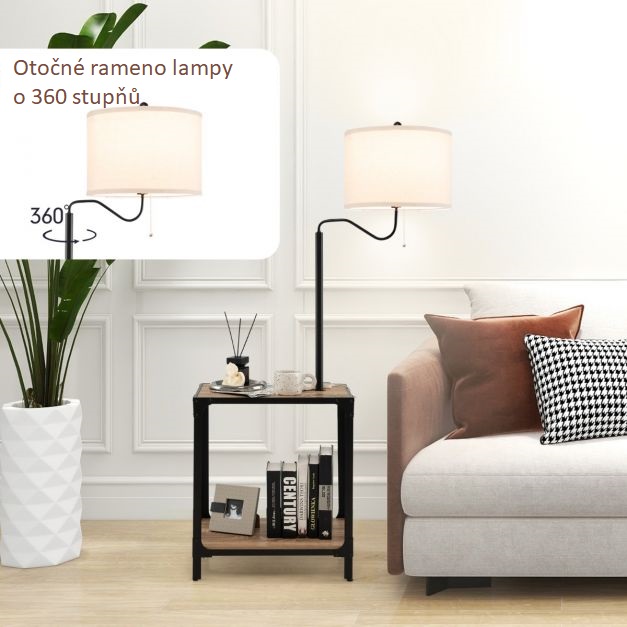 Tento kousek nábytku má design 2v1 - odkládací stolek a lampa, což maximalizuje prostor ve vaší místnosti. Odkládací stolek má dvě police, které poskytují mnoho úložného prostoru například pro vaše knihy nebo jiné potřeby. Pokud si budete chtít číst knihu, jednoduše rozsvítíte světlo pomocí tažného řetízku, a poté si můžete lampu otočit do požadovaného úhlu - je otočná o 360°. Stolek je navíc vybaven dvěma nabíjecími porty, ze kterých můžete např. nabíjet váš telefon. Stolek je vybaven ocelovými rámy a zesílenou MDF deskou, což činí stolek při každodenním používání velmi stabilní a zajišťuje dlouhodobou životnost. Ttento odkládací stolek můžete pohodlně použít ve vaší ložnici nebo obývacím pokoji. Stolek je vybaven napájecím kabelem o délce 2,7 metrů. Balení neobsahuje žárovku do lampy.