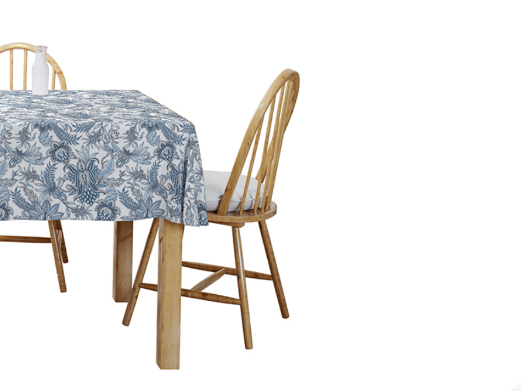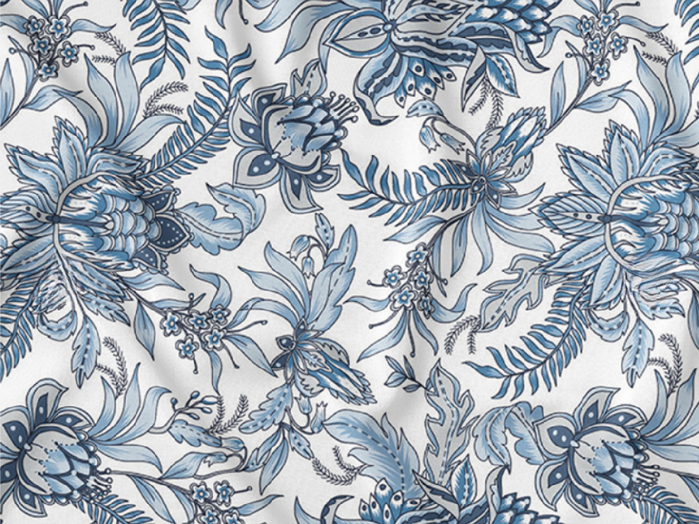 Stylový ubrus s jemným, opakujícím se rostlinným motivem, který kombinuje eleganci s nádechem tradičního designu. Vzor tvoří stylizované květy a listy, je pečlivě vyvážený a působí sofistikovaně, ale zároveň nenuceně. Barevná paleta se pohybuje v různých odstínech modré, což dodává ubrusu hloubku a jemnou vizuální hru. Celkový efekt vzoru je lehce porcelánový, s nádechem klasického modrobílého dekoru typu Delft, díky čemuž ubrus působí nadčasově a vkusně.