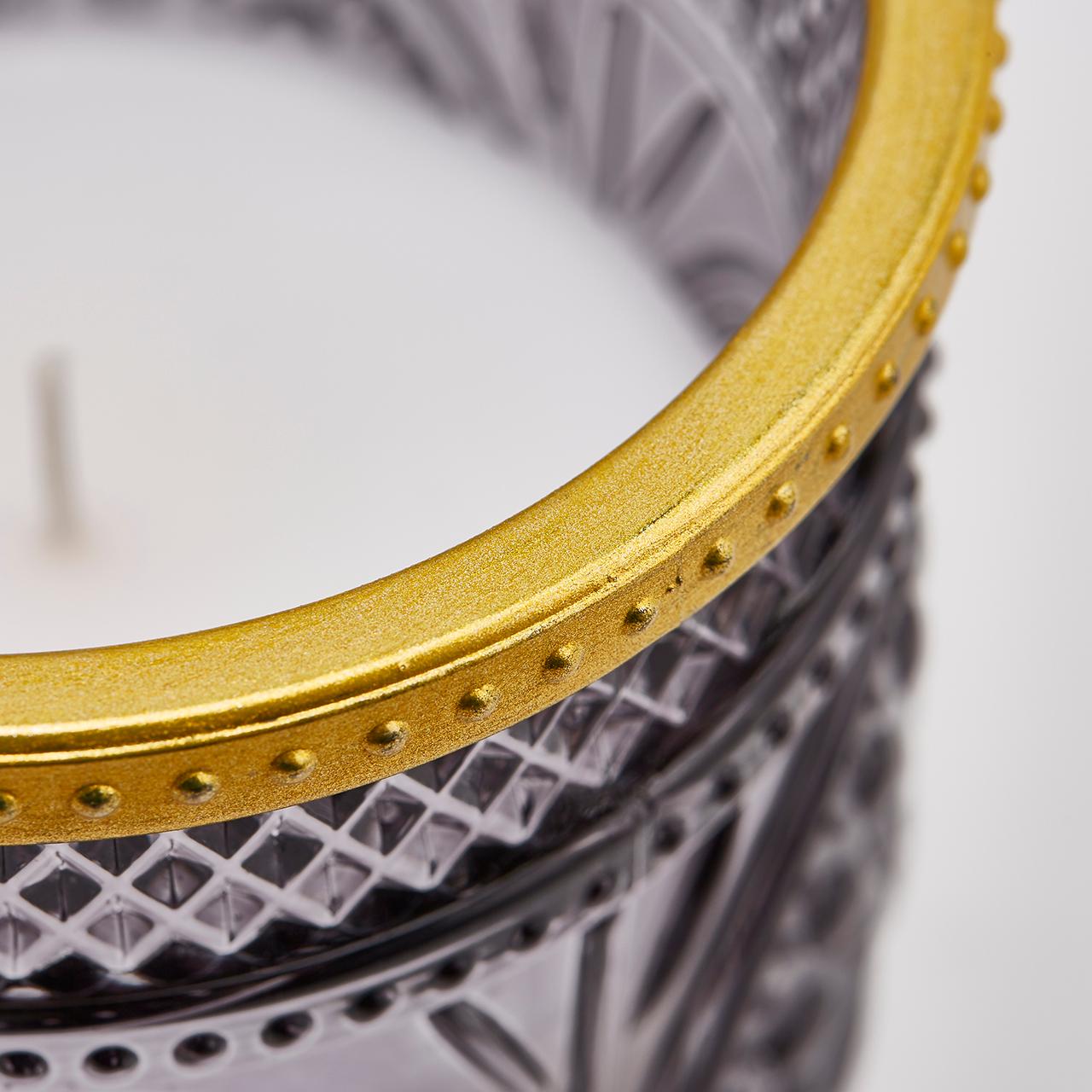Stylově zdobená luxusní svíčka ve vysoké váze z černého skla. Elegantní broušený dekor se zlatým okrajem. Zajímavý interiérový prvek. Po vypálení svíčky můžete použít jako vázu na květiny.