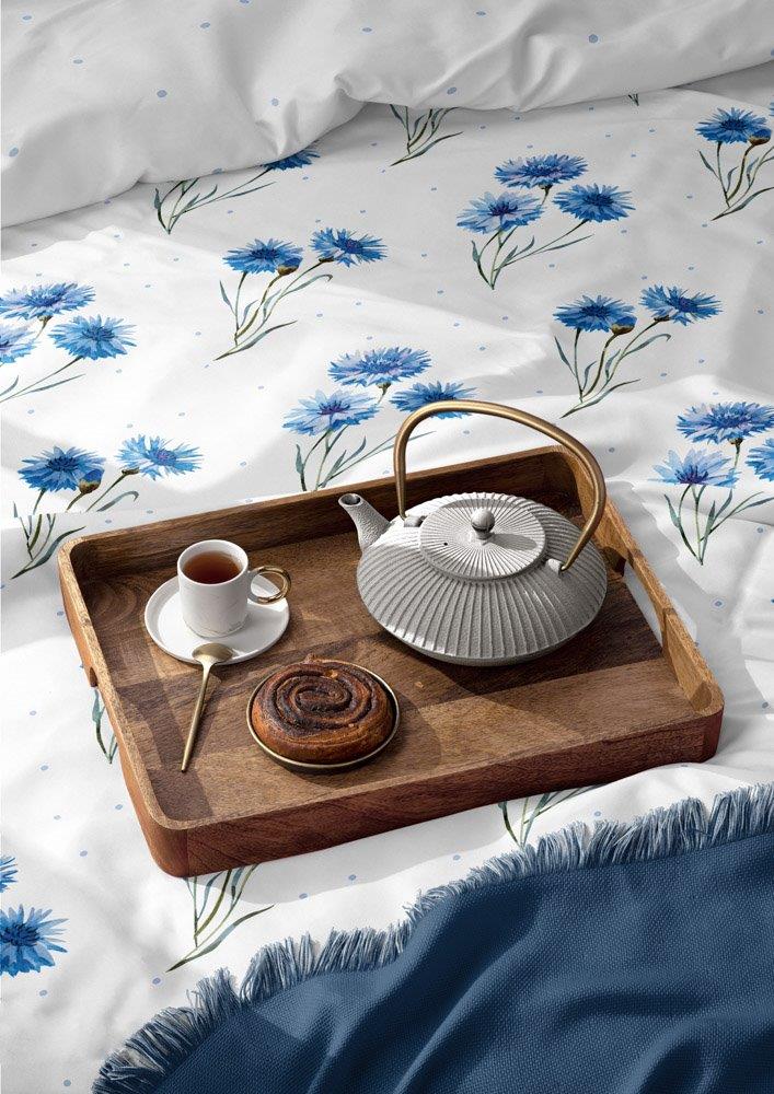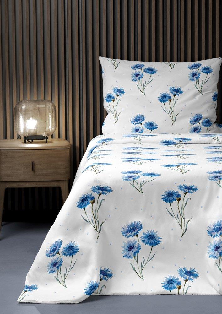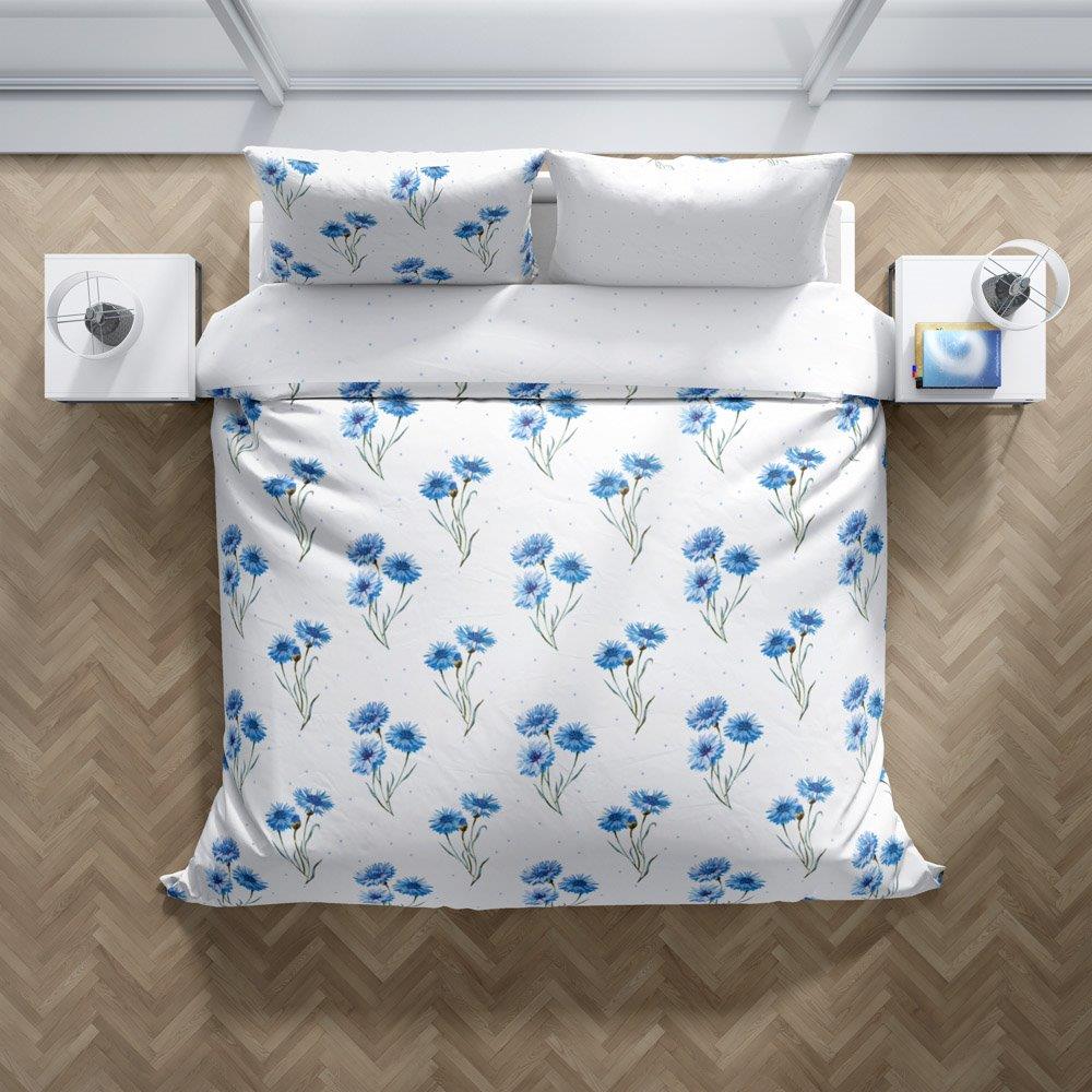 Povlečení s modrými chrpami je v rozměru 140x200 a 70x90 cm v moderním designu. Na přední straně ložního povlečení na bílém podkladu jsou hlavním motivem modré chrpy. Opačná strana povlečení je bílá s modrými puntíky. Povlak polštáře je také oboustranný a svou barvou a vzorem je shodný s povlakem přikrývky. Povlak na přikrývku a polštář je opatřen zipem. Kvalitní bavlna je velice hebká a příjemná na dotek. To se týká jak pevnosti látky, tak její odolnosti vůči následnému praní, díky čemuž povlečení nevybledne a barvy si zachovají svou barvu. Pokud k tomu přidáme zapínání na zip a použití originálního designu, dostaneme produkt, který splní očekávání i těch nejnáročnějších zákazníků.