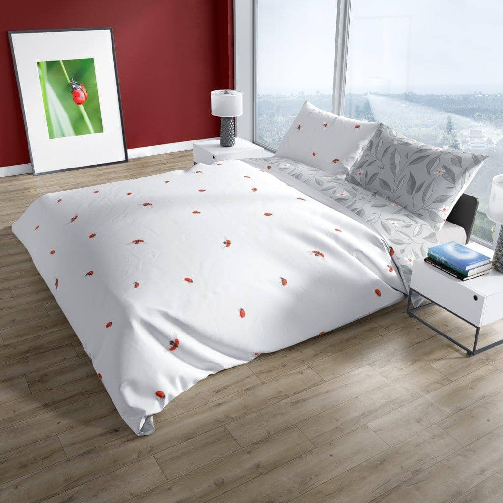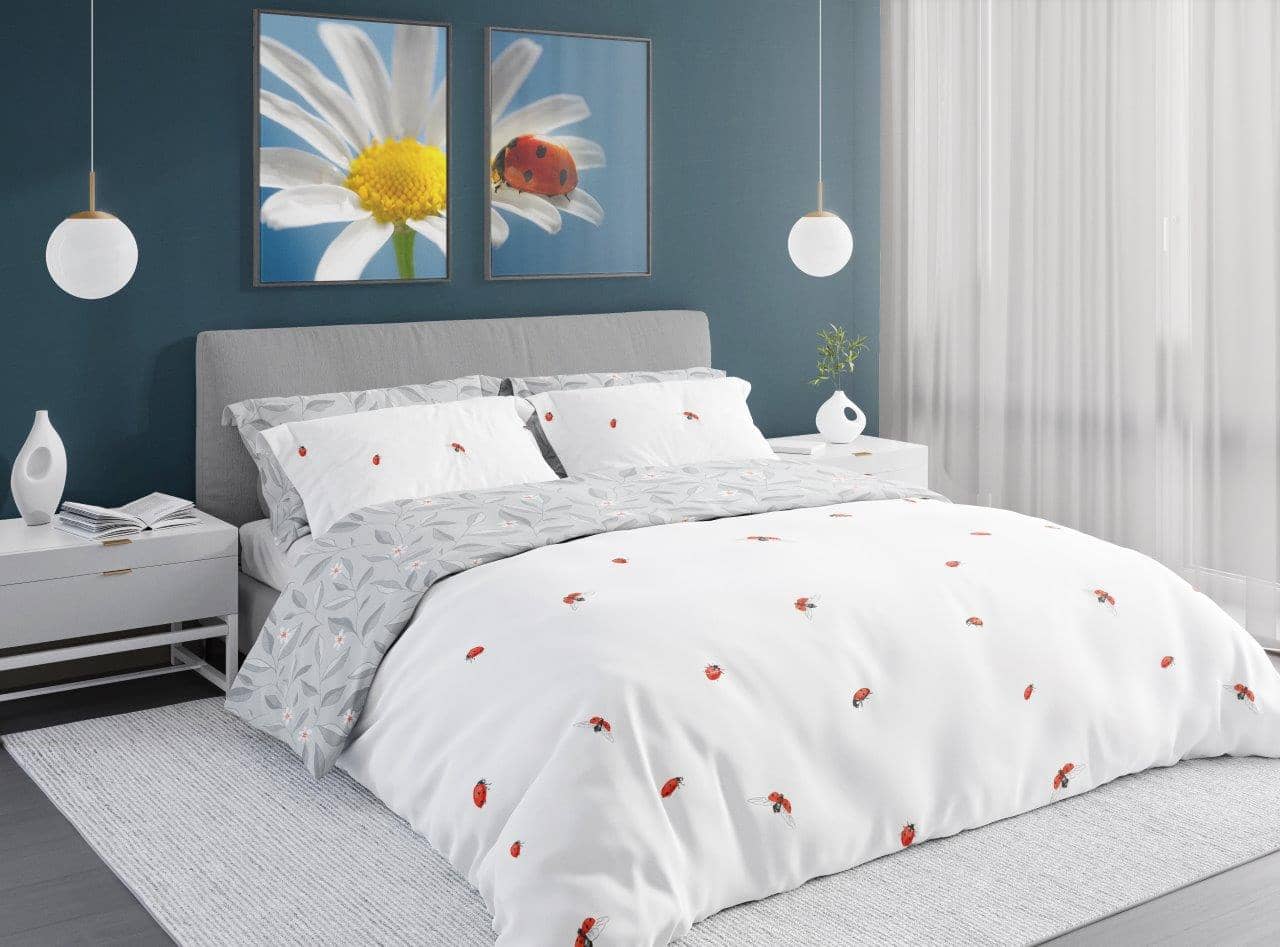 Oboustranné povlečení poskytne variabilitu. Z jedné strany je motiv létajících berušek na bílém a na druhé straně motiv listů na šedé.