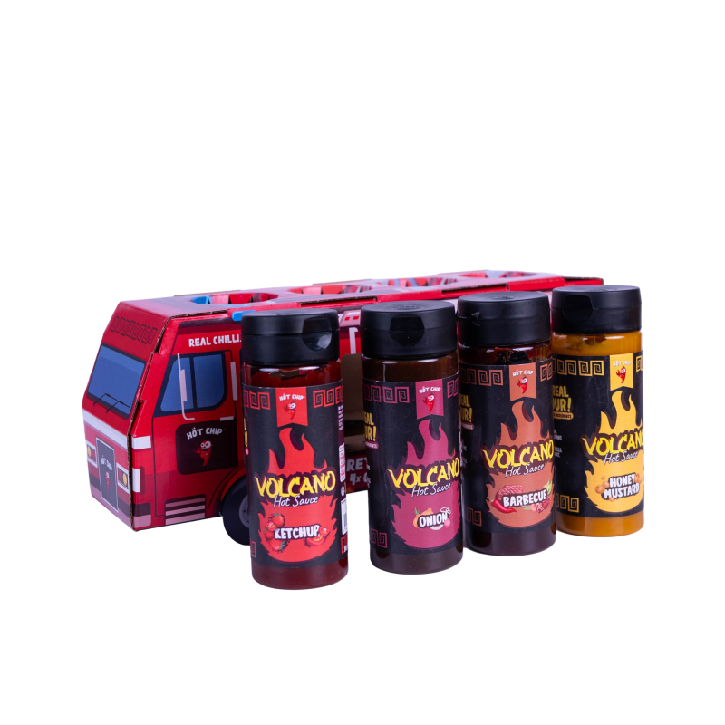 Dárkový box FIRETRUCK Classic spojuje hravý kartonový obal ve tvaru hasičského auta a pečlivě vybrané čtyři omáčky, které se hodí ke grilu i do kuchyně. Obsahuje chilli kečup, hořčici, cibulovou omáčku a BBQ, takže vytvoříš skvělé kombinace chutí pro maso, burgery, domácí hranolky i zeleninu.