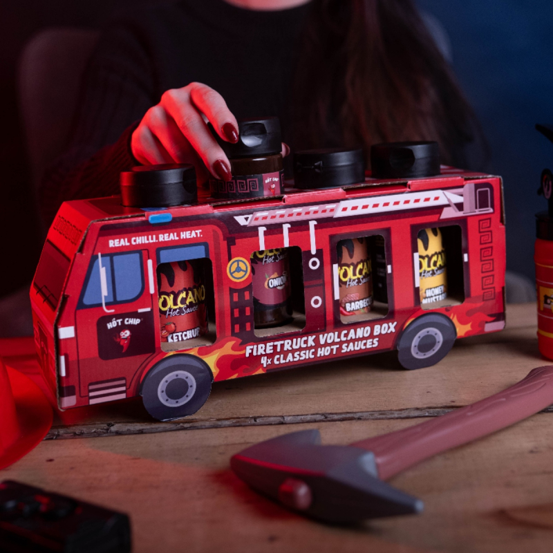 Dárkový box FIRETRUCK Classic spojuje hravý kartonový obal ve tvaru hasičského auta a pečlivě vybrané čtyři omáčky, které se hodí ke grilu i do kuchyně. Obsahuj…