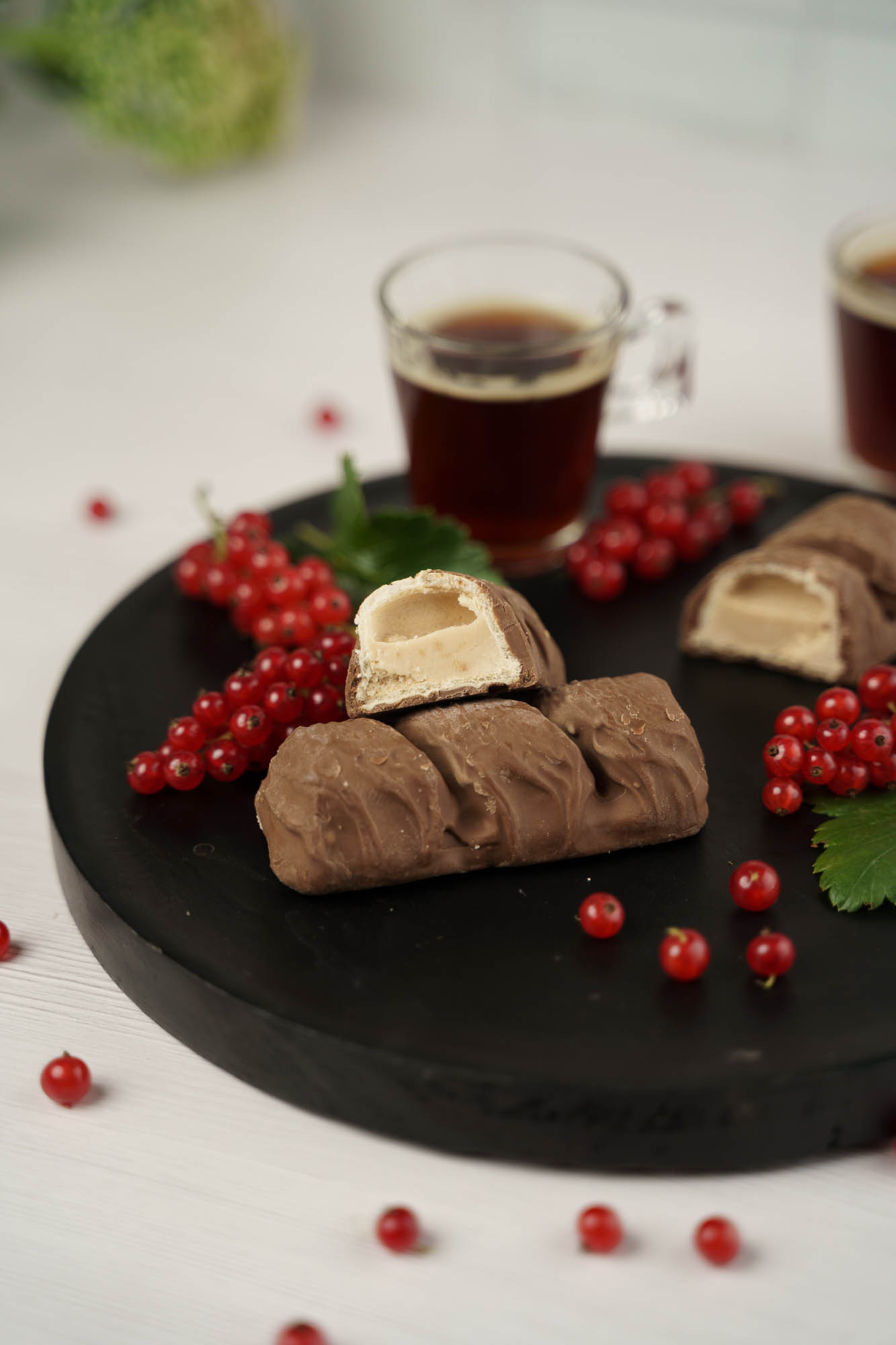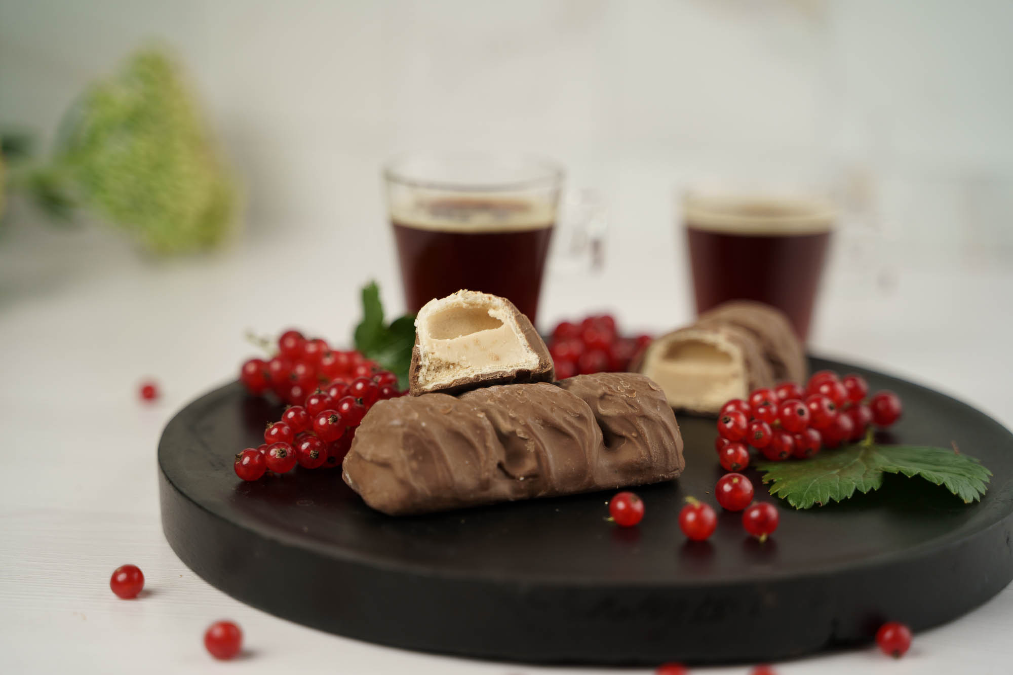 Po jazyku se vám rozlévá sladká chuť a co chvíli vás polechtá špetička soli. Tak tuhle náplň jsme schovali do křupavé oplatky. A ponořili ji do čokolády.