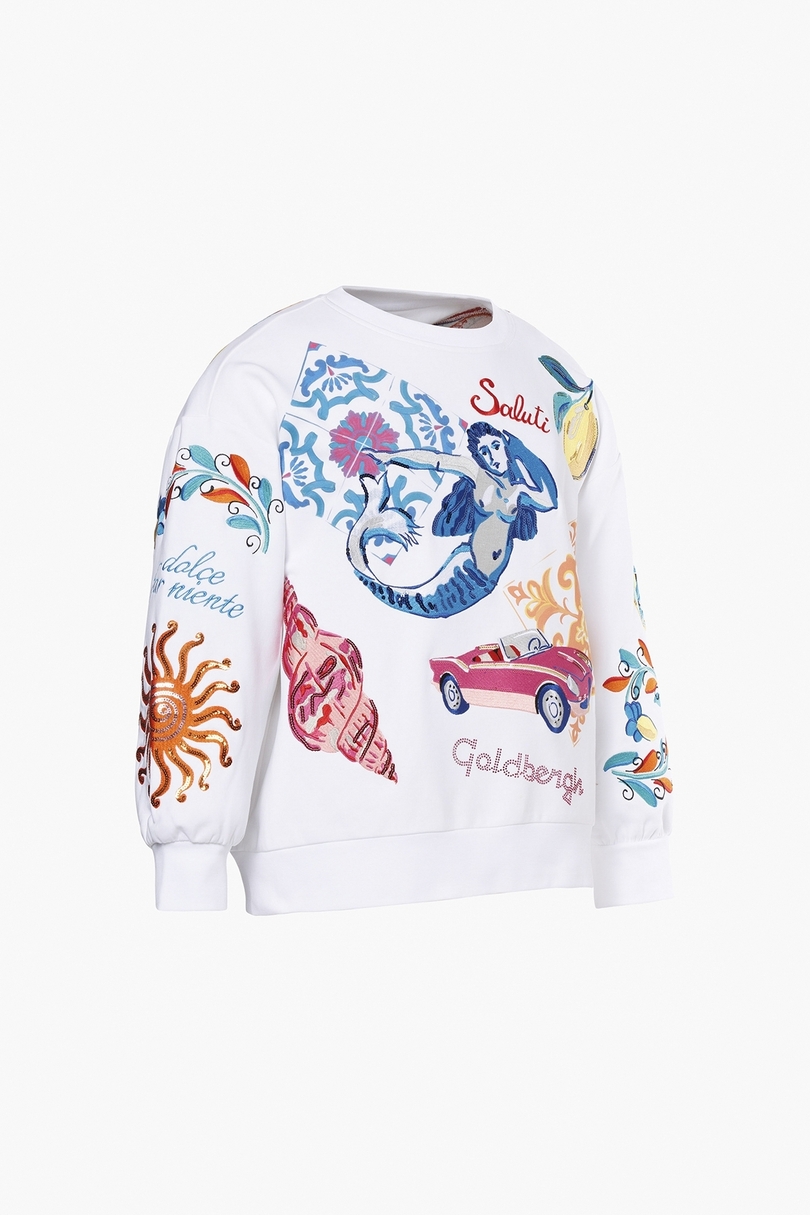 Mikina SERAPHINA zaujme výrazným celoplošným Capri dream vzorom doplneným o jemnú výšivku, ktorá dodáva modelu štýlový a originálny charakter. Ide o moderný kúsok, ktorý spája športový komfort s módnym dizajnom a ľahko sa kombinuje s ďalšími kúskami šatníka. Vyrobená je z kvalitného fleece materiálu s jemne česanou vnútornou stranou, ktorý je príjemný na dotyk a poskytuje komfortné teplo. Rebrovaný okrúhly výstrih, manžety a spodný lem zabezpečujú dobré držanie tvaru a pohodlie počas nosenia. Mikina má voľnejší strih, ktorý vytvára moderný uvoľnený look a zároveň poskytuje dostatok pohodlia. Materiál obsahuje GOTS certifikovanú organickú bavlnu, čo zaručuje ekologickejší prístup k výrobe a vysokú kvalitu. Dizajn dopĺňa gumový štítok Goldbergh na boku ako elegantný značkový detail.