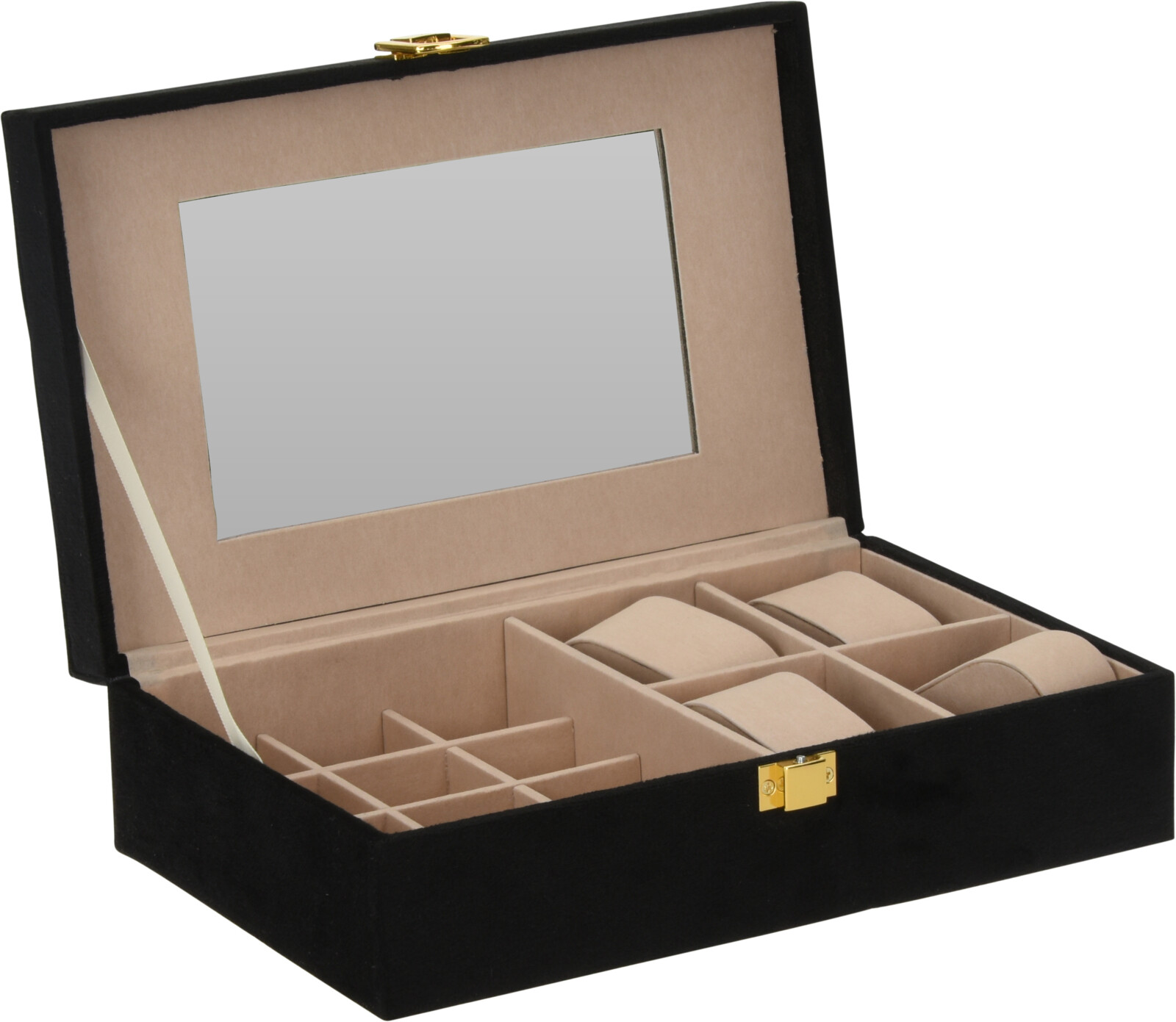 Šperkovnice Velvet se zrcátkem - luxusní úložiště pro Vaše poklady Šperkovnice v elegantní černé barvě s přepychovou béžovou velvetovou podšívkou a zlatým klipe…