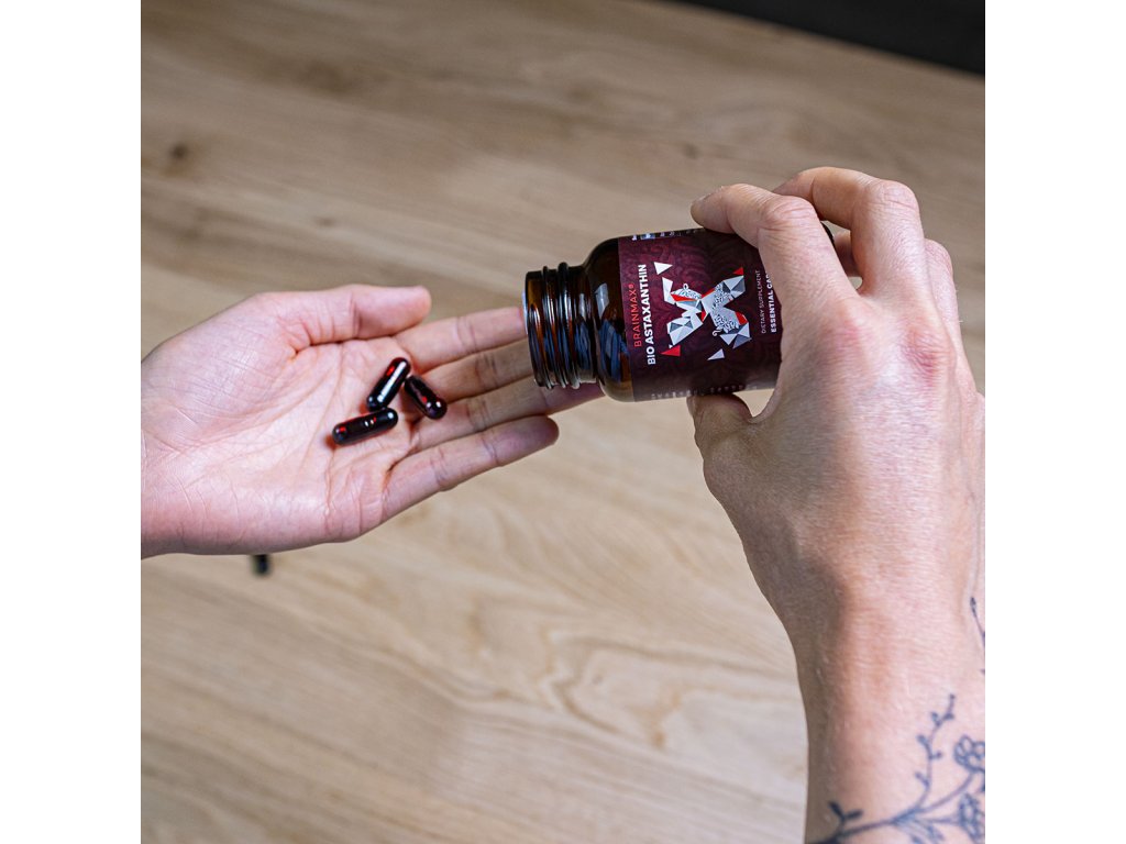 Složení: Bio olivový olej extra panenský, Bio přírodní oleoresin bohatý na astaxanthin z řas Haematococcus pluvialis. Rostlinná kapsle na bázi HPMC. Neobsahuje žádné balastní látky.