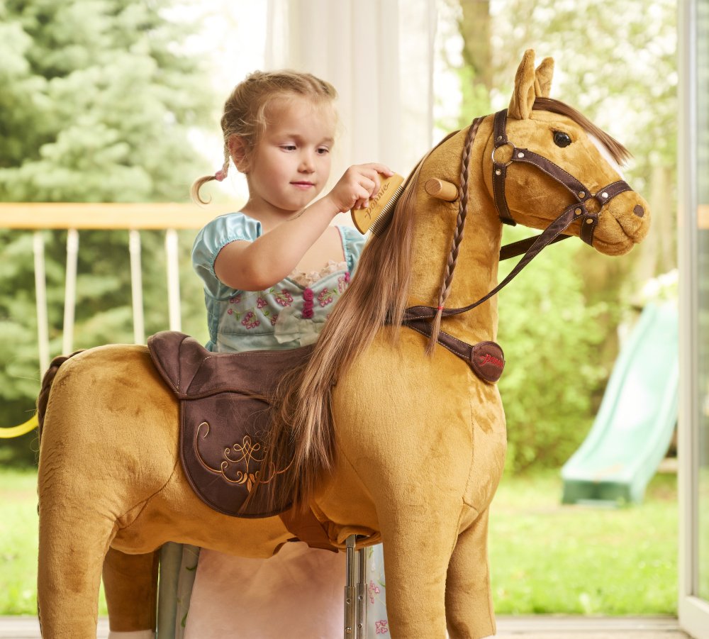 Další výhodou je možnost sedlo i ohlávku s otěžemi sundat – koníka Ponnie tedy můžete osedlat jako živého koně. Hřívu i ocas můžete česat a zaplétat na nich copánky.