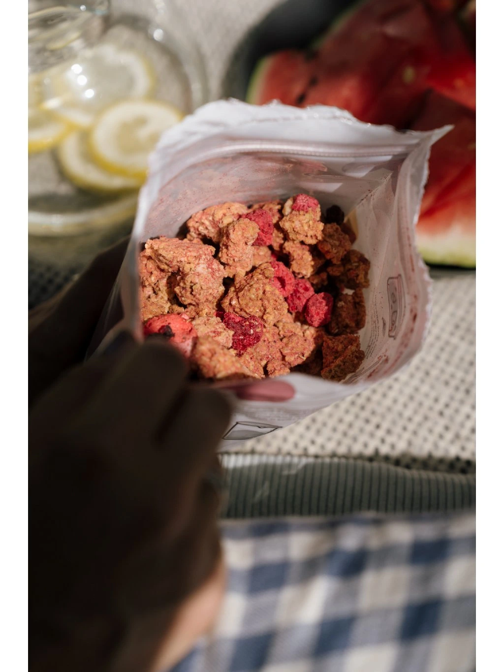 Užijte si harmonické propojení bezlepkových ovesných vloček, mandlí, kešu, mrazem sušených jahod, borůvek a malin. Granolu sladíme rýžovým sirupem a spojujeme prospěšným ghíčkem. Díky vyváženému poměru ovoce a vanilky má jemnou, neodolatelnou chuť. Na lžičku si díky ní naložíte pořádnou porci zdravých tuků a sacharidů.