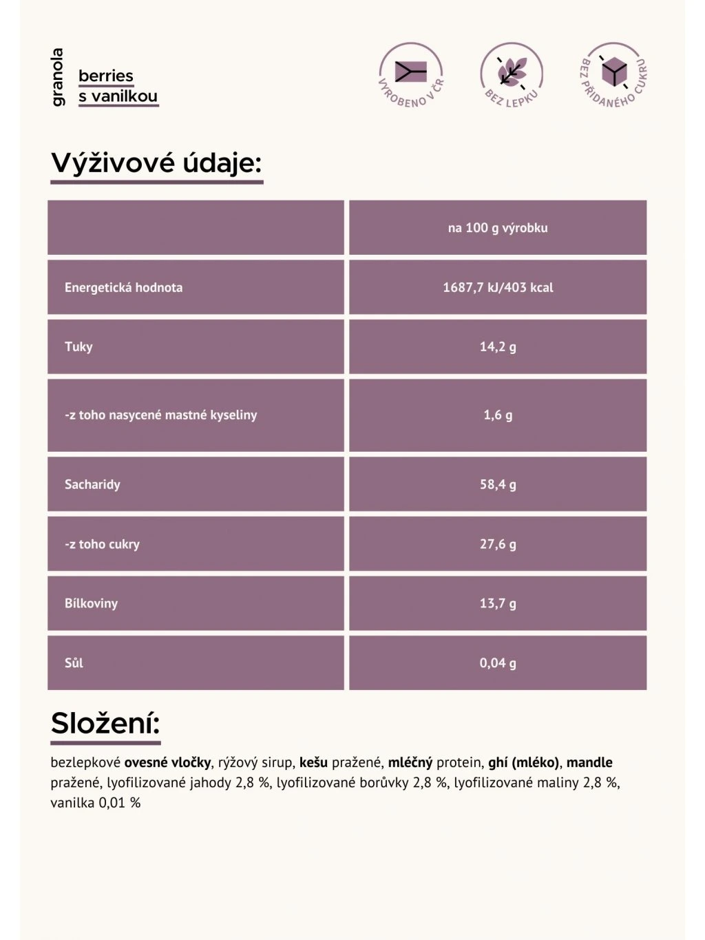 bezlepkové ovesné vločky, rýžový sirup, kešu pražené, mléčný protein, ghí (mléko), mandle pražené, lyofilizované jahody 2,8 %, lyofilizované borůvky 2,8 %, lyofilizované maliny 2,8 %, vanilka 0,01 %