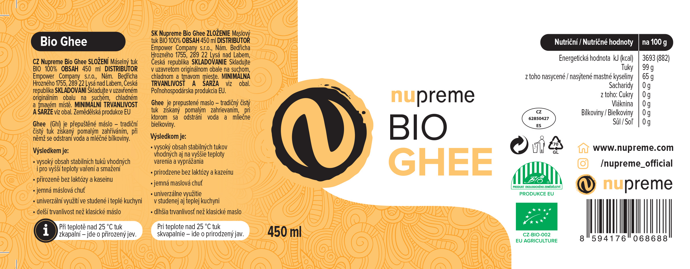 Ghee máslo BIO Nupreme – kvalitní přepuštěné máslo s jemnou chutíGhee máslo vzniká pomalým přepouštěním másla, kdy se odstraní voda a mléčné bílkoviny. Výsledke…