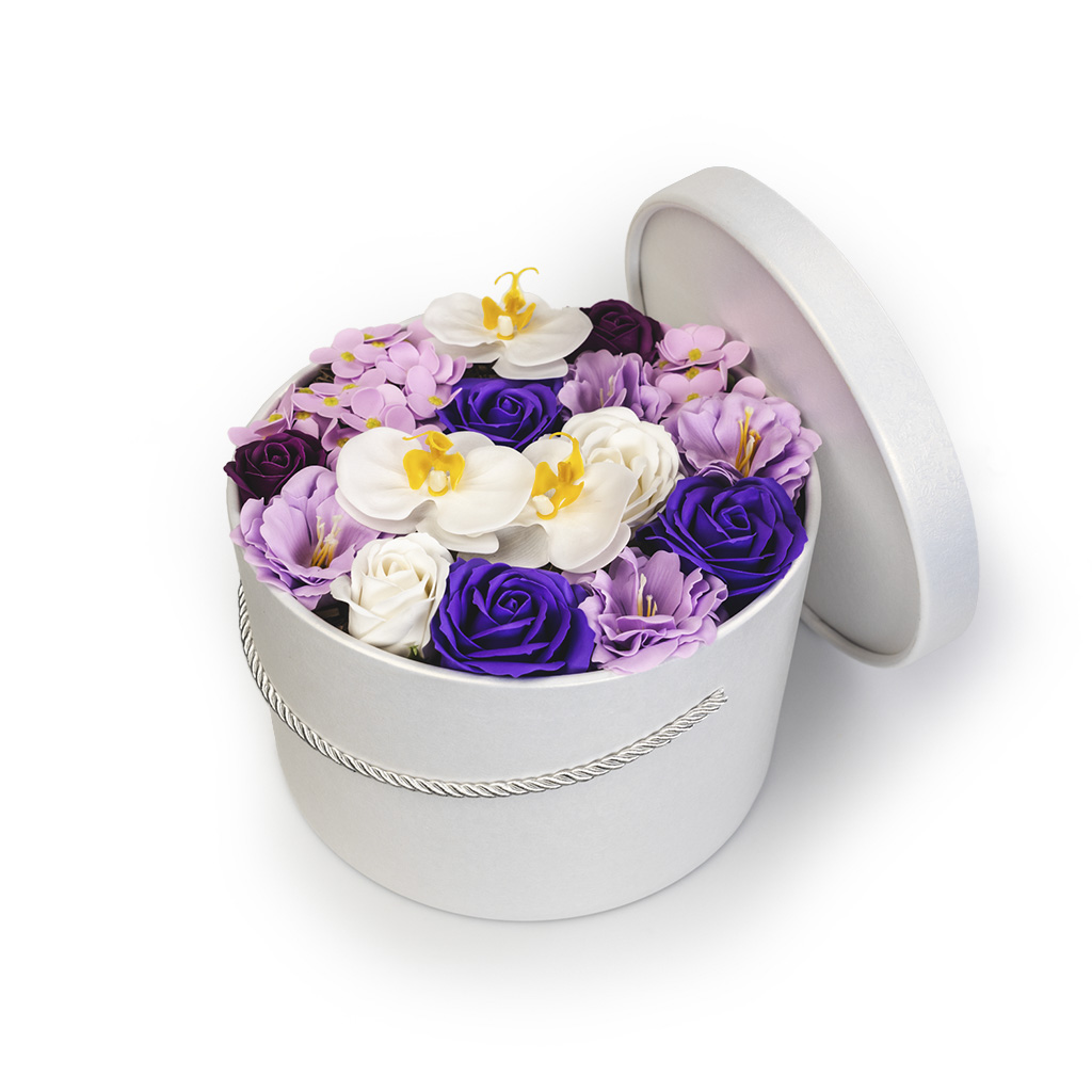 Bílý a jemný design s kombinací fialové dotvoří elegantní dojem z této kombinace. Opatřený bílým poutkem. Rozměr flower boxu - 25cm šířka a 17cm výška.   🎁🎁