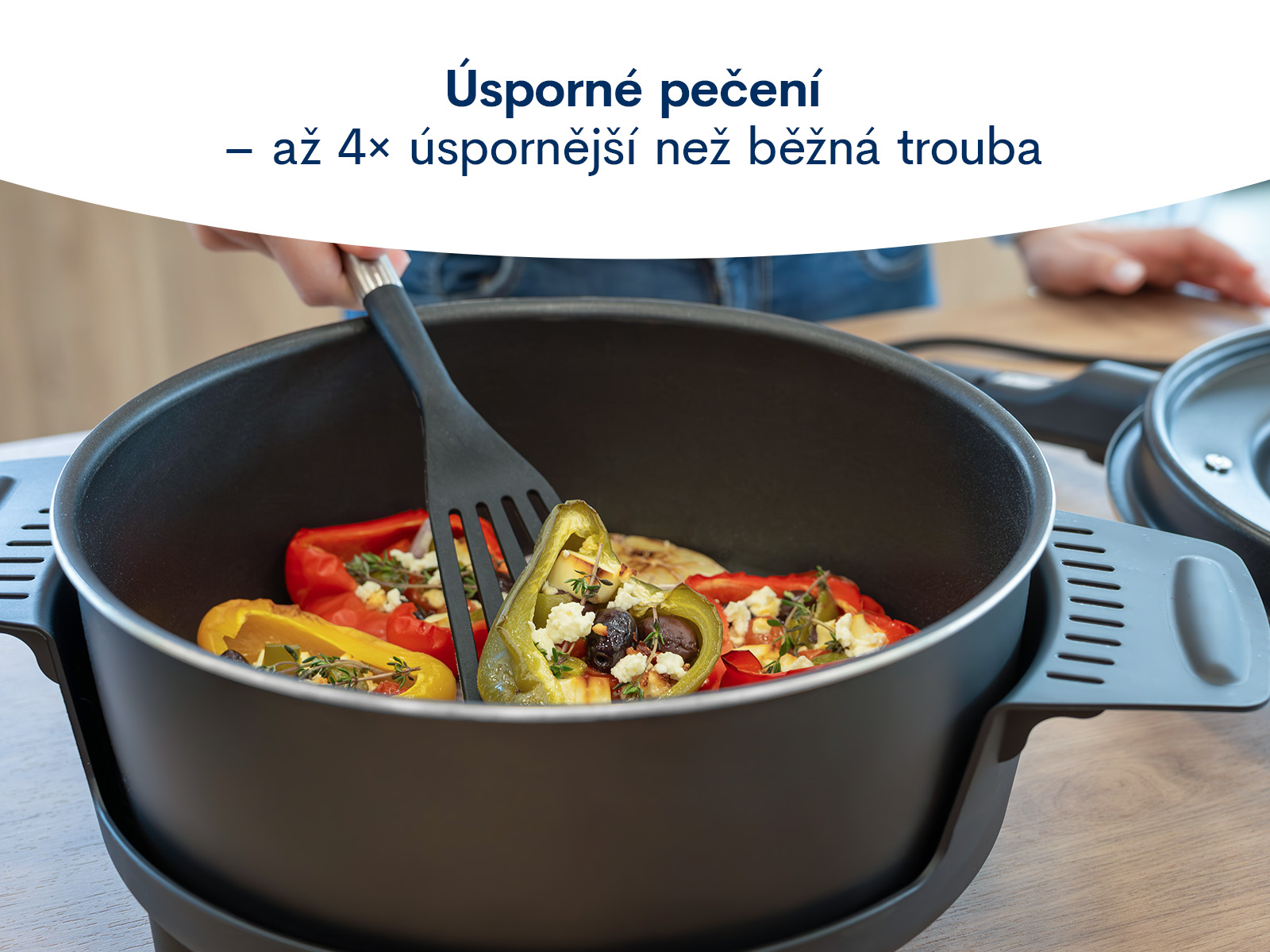 Víko s topným tělesem se skládá ze dvou částí. Spodní topná část je potažena nepřilnavým povrchem Teflon® Classic a zajišťuje dokonalé propečení vašeho jídla. Horní část je potažena nerezovým plechem a umožňuje tak odkládání pečícího víka na pracovní plochu topnou částí směrem vzhůru. Na rukojeti víka pak naleznete i ovládací spínač pečicí mísy. Víko má skleněné okénko.
