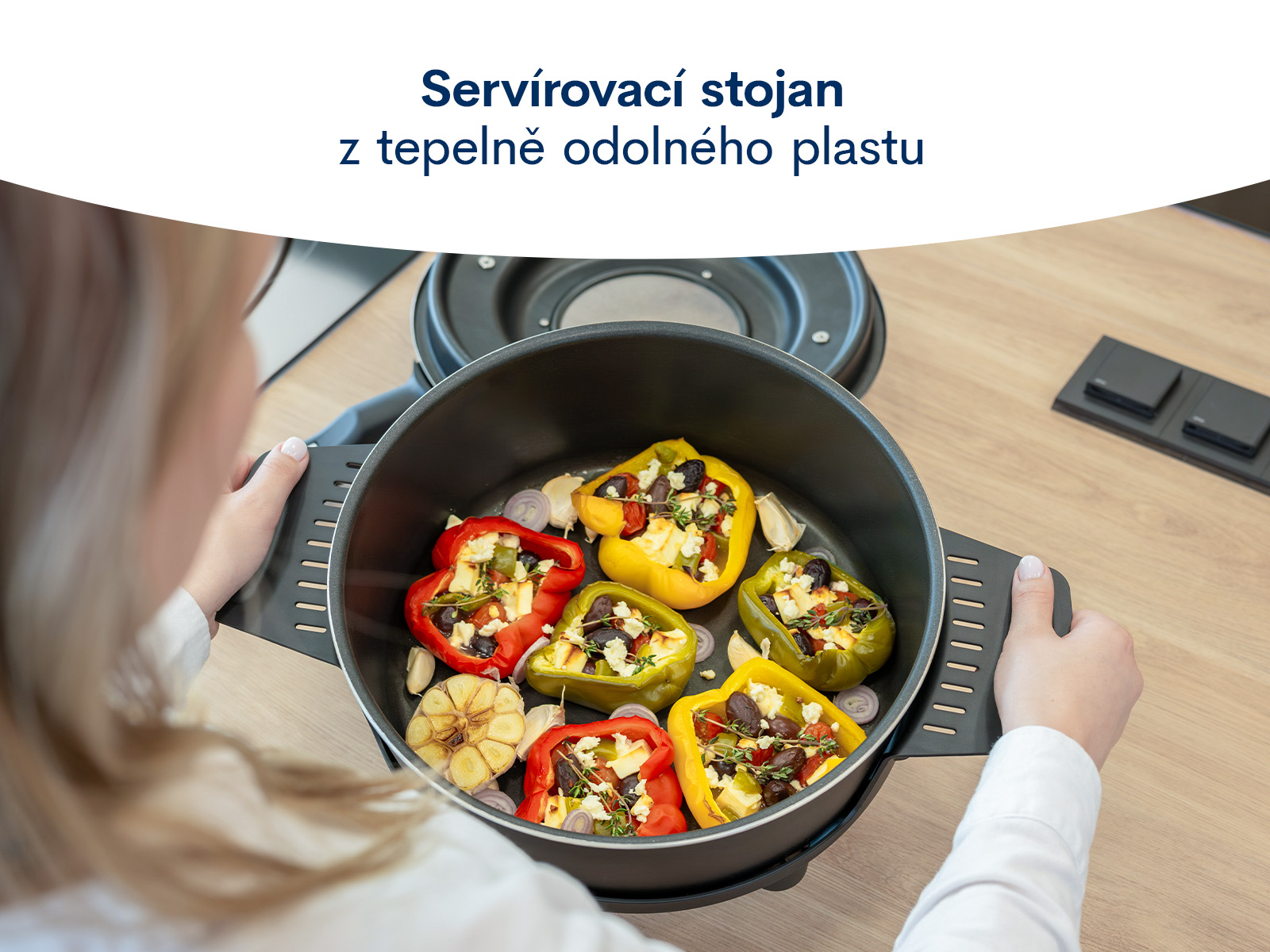 Stojan, který je vyroben z tepelně odolného plastu slouží ke snadné manipulaci s mísou během vaření ale i pro následné servírování pokrmů přímo na stůl.