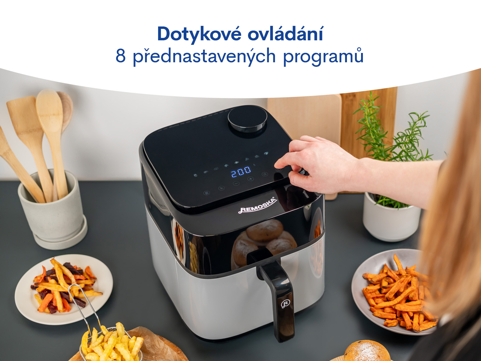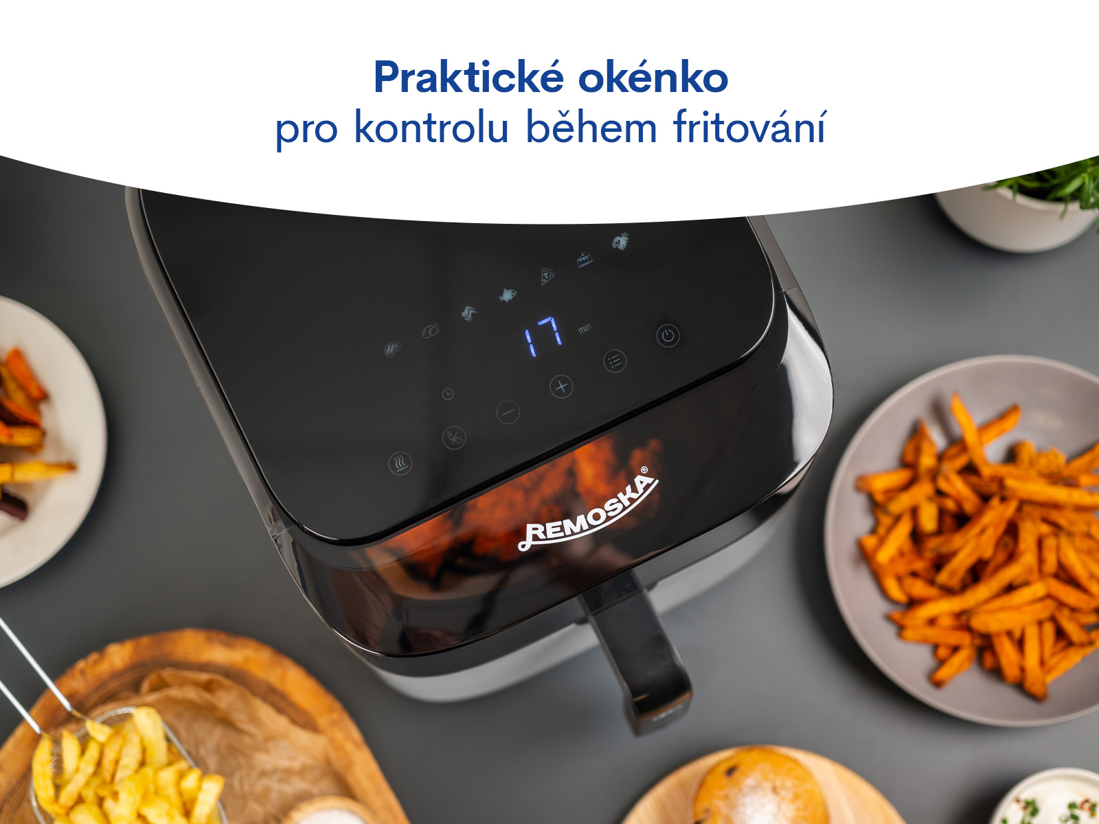 Remoska® Vento SteamChef je vybavena 8 přednastavenými programy: Steaky, Křidélka, Krevety, Ryby, Pizza, Hranolky, Zákusky, Zelenina. Pokud vám programy nevyhovují, můžete sami snadno regulovat teplotu pomocí termostatu v rozmezí 60 °C až 200 °C. Fritéza je také vybavena časovačem s funkcí automatického vypnutí a zvukovou signalizací. Časovač je možné libovolně nastavit v rozsahu 0 až 99 minut.