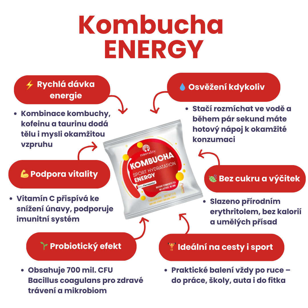 Kombucha ENERGY 12 gPřírodní energie a osvěžení v jedné dávce – vždy po ruceKombucha ENERGY je inovativní instantní doplněk stravy, který spojuje svěží chuť fer…